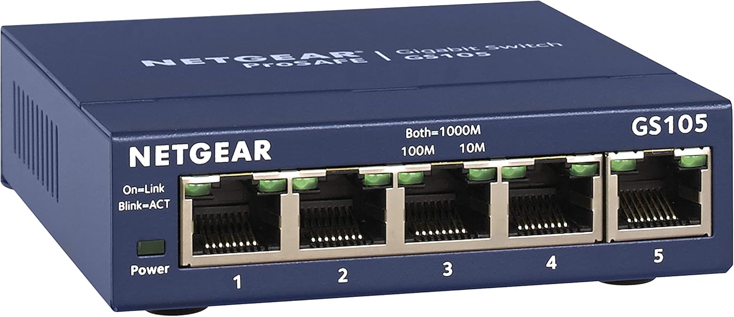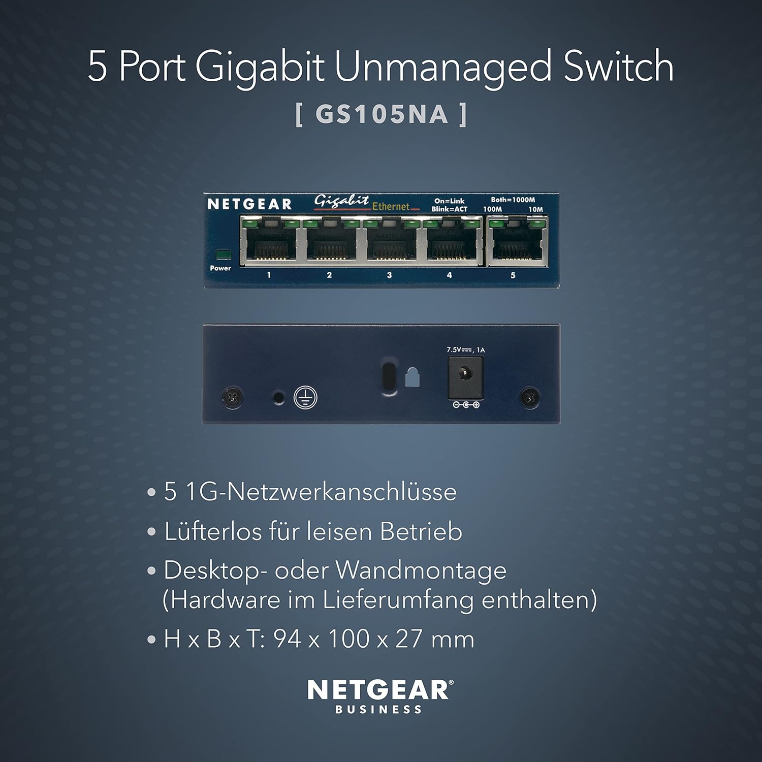 NETGEAR GS105GE LAN Switch 5 Port Netzwerk Switch (Plug-and-Play Gigabit Switch LAN Splitter, LAN Verteiler, Ethernet Hub, lüfterloses Metallgehäuse