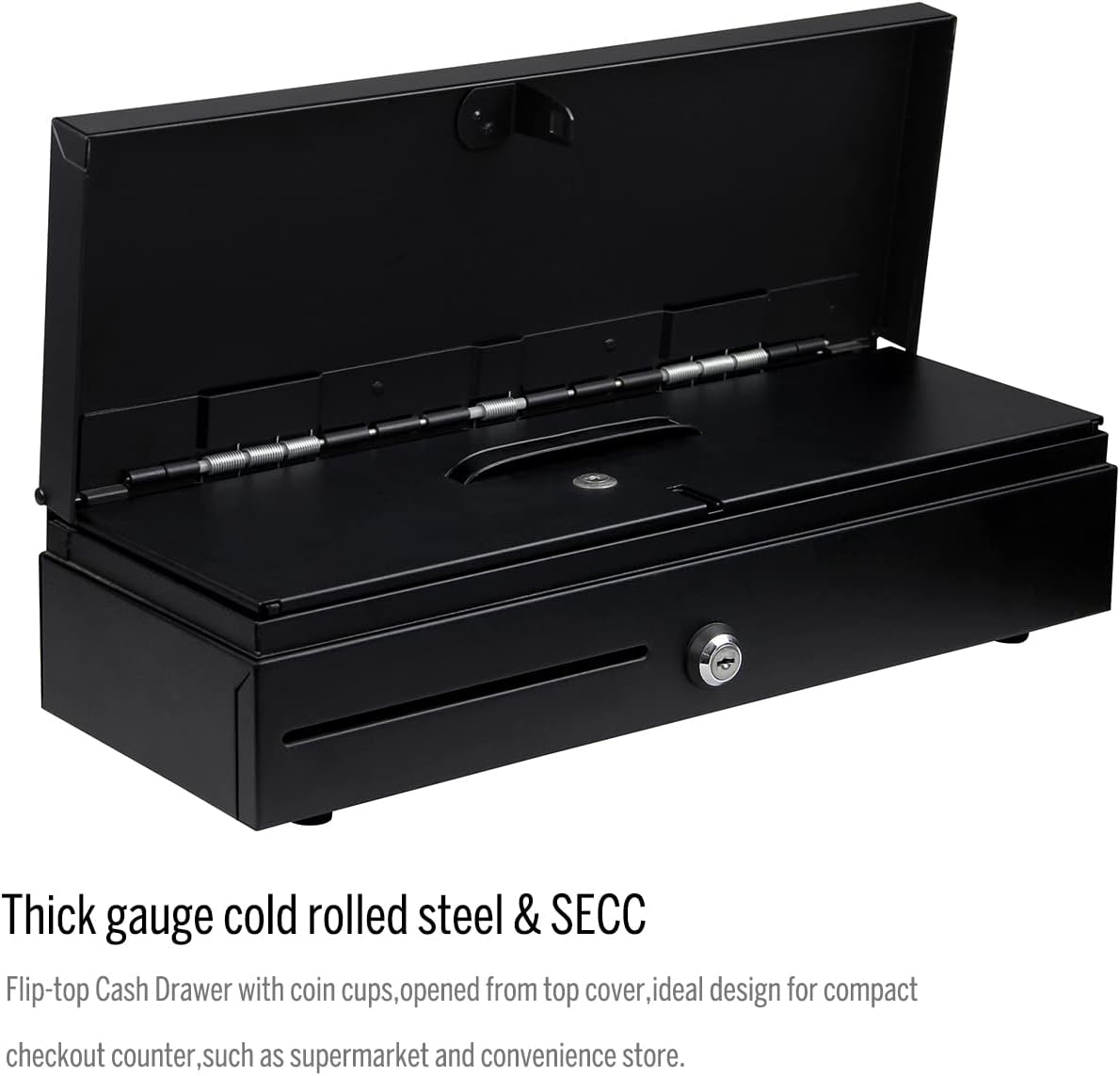- 1.Die Flip-Top-Kassenschublade besteht aus dickwandigem kaltgewalztem Stahl und SECC, mit Münzbechern, die von der oberen Abdeckung geöffnet werden, ideales Design für kompakte Kassen wie Supermärkte und Supermärkte.