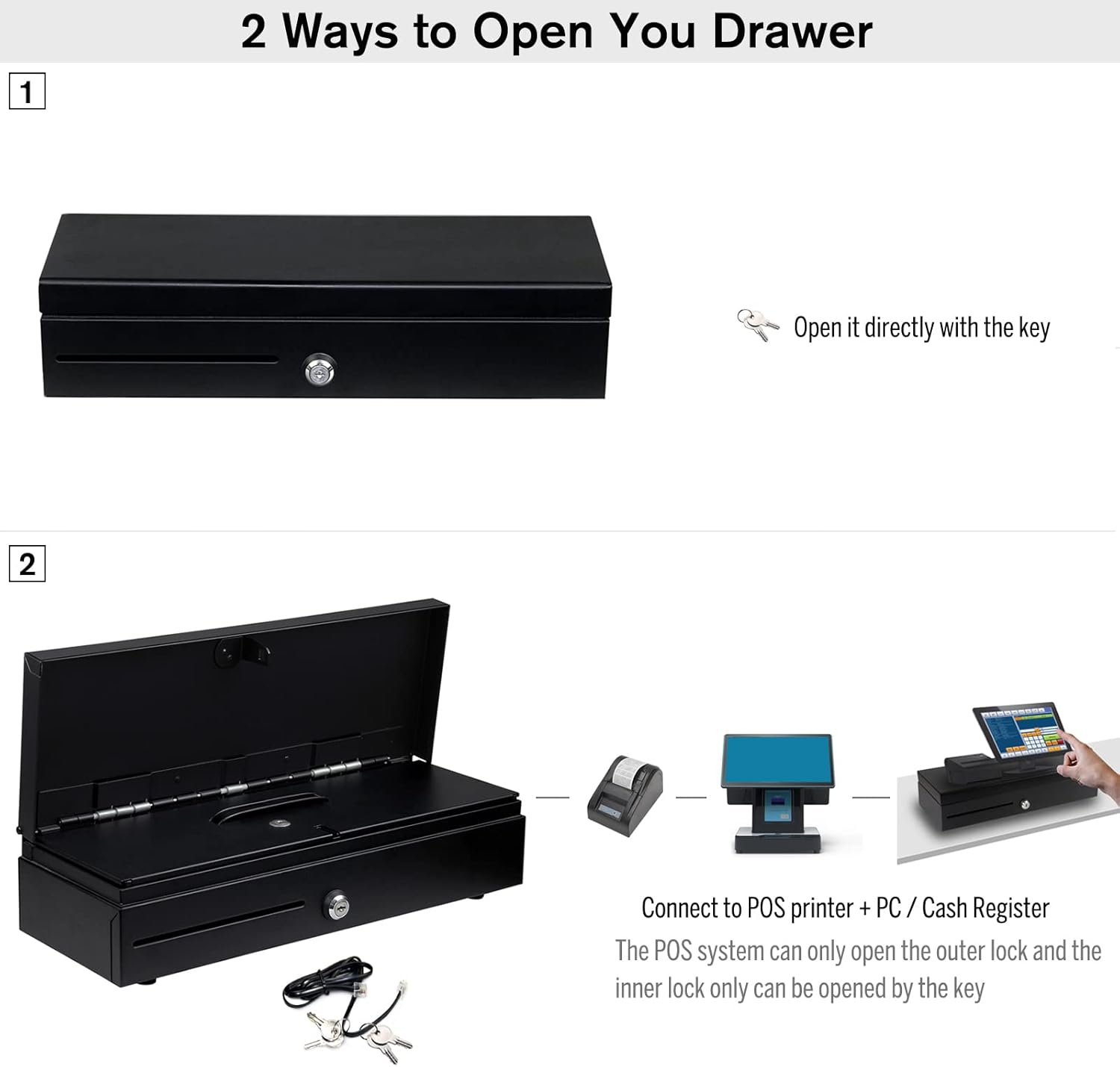 - 4. Öffnen Sie die Kassenschublade durch einfaches Drehen des Schlüssels oder verbinden Sie das RJ11-Druckerkabel mit einem Kassenbon (POS)